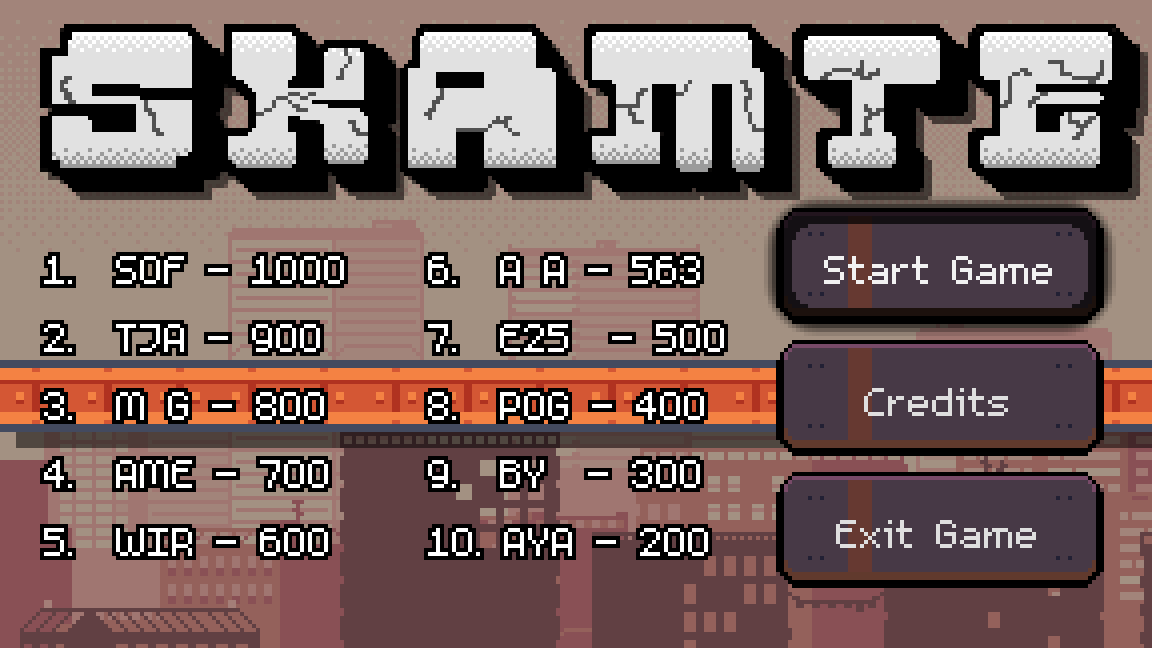 SKAMTE is an Endless runner based on Skateboarding. Made to mimic the arcade experience, short snappy play sessions and a competitive leaderboard.
